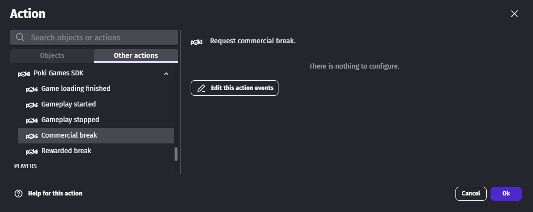 Ads can be displayed using either the Commercial break or Rewarded break actions. Please refer to Poki's ads best practices to understand when to use one or the other.